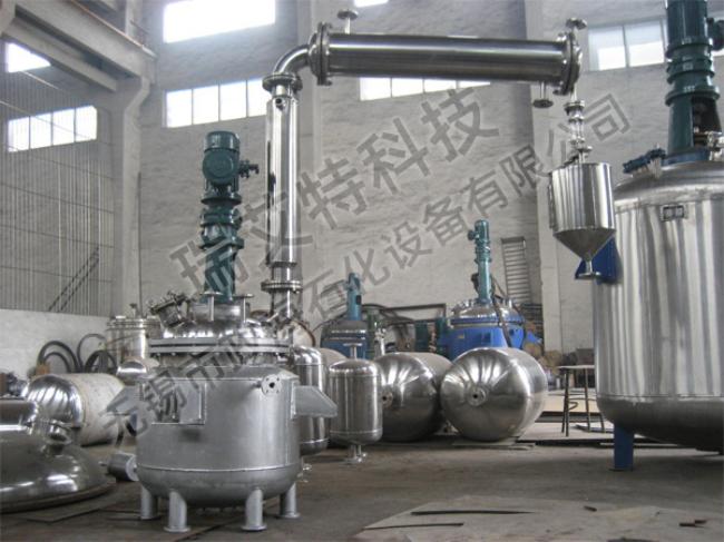 反應釜由鍋體、鍋蓋、攪拌器、電加熱油夾管、支承及傳動裝置、軸封裝置、溢油槽等組成,并配有電加熱棒及測溫、測壓表。
